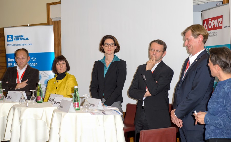 Noch vor dem Mittagessen referiert Hansjörg Tutner (MAGNA STEYR AG) über neue Arbeitszeitmodelle. Er gibt Beispiele, wie MAGNA mit den neuen flexiblen Arbeitszeiten umgeht und spricht über Telearbeit und Crowdworking. Das Unternehmen bietet eine individuelle Flexibilisierung der Arbeitszeit, ein erweitertes Gleitzeitmodell mit kurzer Kernarbeitszeit, Homeoffice, Sabbatical-Möglichkeiten und seit September auch die Magna Kids World, also einen Betriebskindergarten.